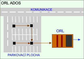 Na obrázku je znázorněno schéma použití objektu ORL firmy ADOS k čištění odpadních vod z parkovacích ploch.